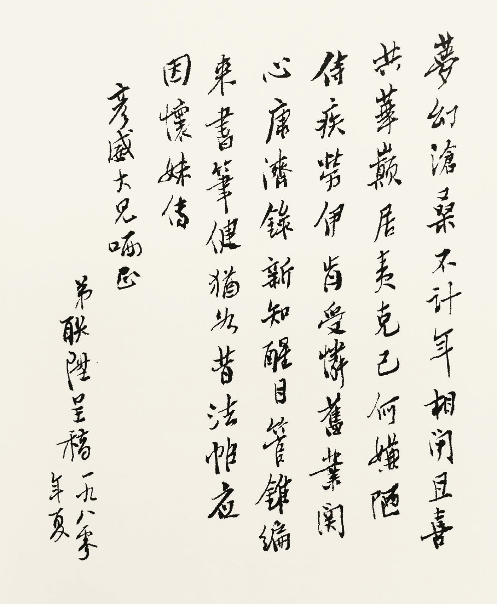 “夢幻滄桑不計年,相聞且喜共華巔。居夷克己何嫌陋,侍疾勞伊肯受憐。舊業(yè)關(guān)心康濟錄,新知醒目管錐編。來書筆健尤如昔,法帖應因懷妹傳。”《和彥威兄》,1980年7月11日。(繆鉞,字彥威,歷史學家、中國古典文學家,四川大學教授,也是楊聯(lián)陞妻繆鉁之兄。)