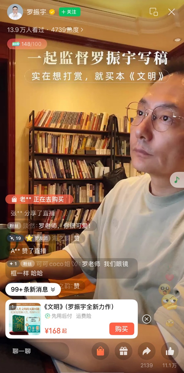 同時(shí),羅振宇直播間屏幕上不斷跳出《文明》被搶購(gòu)的成交提示,商品頁(yè)銷量顯示2700多本,更成為這種寫作直播的附加產(chǎn)品。
