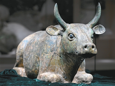 鎏金銅牛作為寧夏博物館的“鎮(zhèn)館之寶”,代表了西夏時期鑄造工藝的最高水平。銅牛1977年出土于銀川西夏陵101號陪葬墓,通體鎏金,內部空心。造型獨特,為跪臥姿勢,雙角彎曲,雙耳外展,鼻子微微上翹,眼睛圓睜且向外凸,注視著遠方,好像勞累一天的黃牛在跪臥休息時,突然聽到遠處主人的呼喚,抬頭遠望、目閃靈光。這件銅牛集塑形、鑄造、鎏金、拋光等多種工藝于一身,達到了神形兼?zhèn)涞乃囆g效果。以銅牛為隨葬品反映了西夏農(nóng)耕經(jīng)濟的興盛。