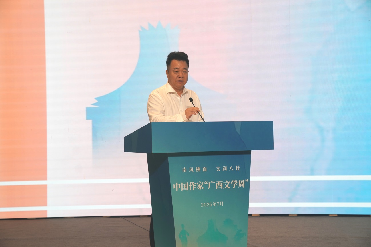 東西在致辭中談到,中國作家“廣西文學(xué)周”的舉辦,是中國作協(xié)對八桂大地的一次文學(xué)饋贈(zèng),是對廣西文學(xué)事業(yè)發(fā)展和廣西作家協(xié)會(huì)工作的信任和肯定。近年來,廣西文學(xué)事業(yè)呈現(xiàn)出蓬勃發(fā)展的良好態(tài)勢。作品數(shù)量和質(zhì)量顯著提升,多部作品在全國重要文學(xué)評選中獲得佳績,展現(xiàn)了“文學(xué)桂軍”的整體實(shí)力和獨(dú)特魅力。廣西作家協(xié)會(huì)以“實(shí)干為要,創(chuàng)新為魂,用業(yè)績說話,讓人民評價(jià)”為準(zhǔn)則,始終堅(jiān)持以人民為中心的創(chuàng)作導(dǎo)向,高度重視基層作家培養(yǎng),高度重視文學(xué)的社會(huì)功能,用優(yōu)秀的作品和豐富多彩的活動(dòng)普惠大眾。廣西作家協(xié)會(huì)將以此次文學(xué)周為契機(jī),繼續(xù)團(tuán)結(jié)帶領(lǐng)全區(qū)作家,深入生活、扎根人民,努力創(chuàng)作更多反映時(shí)代精神、展現(xiàn)廣西特色的優(yōu)秀作品。
