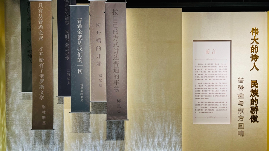系列互動裝置吸引讀者走進普希金的文學世界,回顧其一生璀璨的創(chuàng)作成就。展覽入口處,一條條懸掛的語錄條幅上,書寫了多位文學評論家對普希金的贊譽。這些評語在3D動態(tài)水紋燈的映襯下,宛如通往詩人世界的導引,為觀眾開啟一場跨越時空的對話。高爾基稱之為“一切開端的開端”,丘特切夫評價其是“俄羅斯的初戀 我們不會忘記你”,別林斯基說“只有從普希金起 才開始有了俄羅斯文學”,格里高里耶夫甚至驚呼“普希金就是我們的一切”……