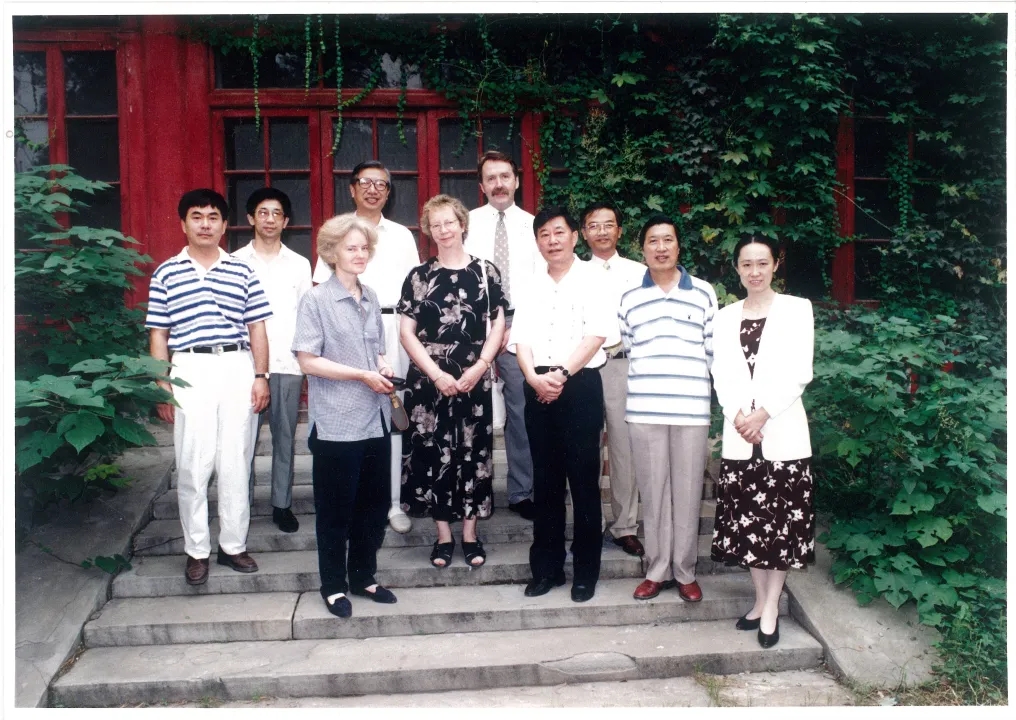 九十年代初,在文學(xué)館舊址萬壽寺與館長舒乙(前排右三)、副館長吳福輝(后排左三)、周明(右二),及館員于潤琦、劉屏(后排左一二)接待外國學(xué)者