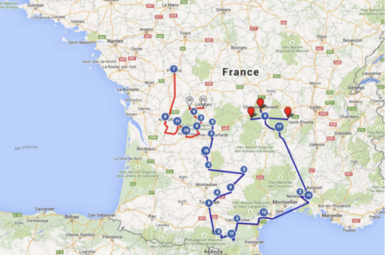 布列桑的地圖追溯了龐德1912年徒步旅行的兩個部分:第一個部分,從普瓦捷到利摩日,以紅色路徑和藍色標記,發(fā)生在5月26日和6月7日/8日之間;第二個部分,從烏澤切到克萊蒙費朗,以藍色路徑和紅色標記標示,時間是從6月27日持續(xù)到大約7月18日。