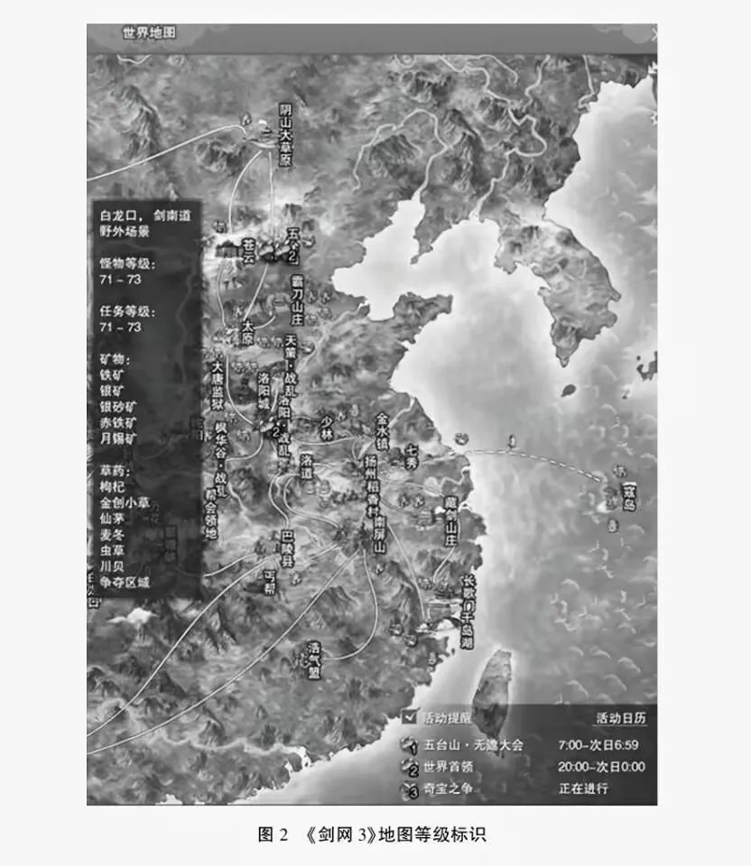 但在如今的開放世界游戲中,大多也保留著“升級”這一隱性導航機制。游戲設計者們也面臨著《龍與地下城》初版規(guī)則一般的疑問:如何在開放自由的世界與自主的玩家行為中,把握游戲的敘事節(jié)奏,平衡游戲難度?除卻鳳毛麟角的設計④,大部分“公式化開放世界”采用的仍然是升級導航機制,如《刺客信條·起源》與其后的系列作品,相對于《刺客信條》系列前作,似乎去除了隨劇情解鎖區(qū)域的限制,擁有全解鎖的地圖,顯得更加“開放”,但仍靠區(qū)域的怪物等級壓制,將玩家的行動軌跡圈定在角色等級允許的范圍內,生成相對線性的流程。與之類似的是網絡游戲,如《魔獸世界》《劍網3》等,網絡游戲往往也是一種開放世界游戲,擁有全開放的地圖與自主的玩家行為。但《魔獸世界》和《劍網3》均標注出“地圖建議等級”,并以此延伸出官方的“建議升級流程”,在開放世界中用“升級”勾勒出線性的玩家行為軌跡。
