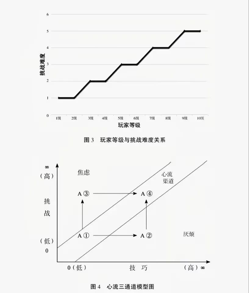 在游戲設計中,心流與升級機制息息相關。正如前文所論證的,在標志升級機制成熟的《龍與地下城》游戲中,升級這一機制最開始是為了給DM調控遭遇戰(zhàn)難度,并更好地規(guī)劃出一條相對線性的游戲內容。在強調技能程度和挑戰(zhàn)難度關系的心流理論中,升級機制起到了對這種關系進行“動態(tài)調控”的作用:玩家在升級后進入新地圖,敵人的難度對于玩家是高的、具有挑戰(zhàn)性的,隨著玩家戰(zhàn)斗經驗的累積,玩家再度升級,自身能力提升,地圖中的敵人難度會相應降低,此時往往會迎戰(zhàn)地圖關卡的高難度BOSS,戰(zhàn)后再度升級,進入新的等級地圖,從而進入一種階梯狀的難度循環(huán)。如果我們將這種玩家升級和難度體驗之間的關系畫出一幅折線圖,我們會發(fā)現(xiàn)它與心流理論的三通道模型圖非常相似——很多游戲正是利用升級,來保證玩家始終處于心流的體驗中。