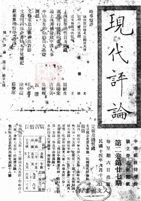 春臺小峰之爭,蓋其中還有他們的糾葛,但觀《北新周刊》所登廣告,則確已多出關(guān)于政治之小本子廣州近來,亦惟定價兩三角之小本子能多銷,蓋學(xué)生已窮矣,而陳翰笙似大有關(guān)系,或者現(xiàn)代派已侵入北新,亦未可知,因凡現(xiàn)代派,皆不自開辟,而襲取他人已成之局者也。[22](1927年7月7日)