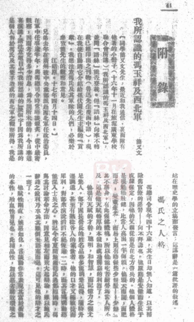 《我所認識的馮玉祥及西北軍》原載《貢獻》1928年第3卷第1期