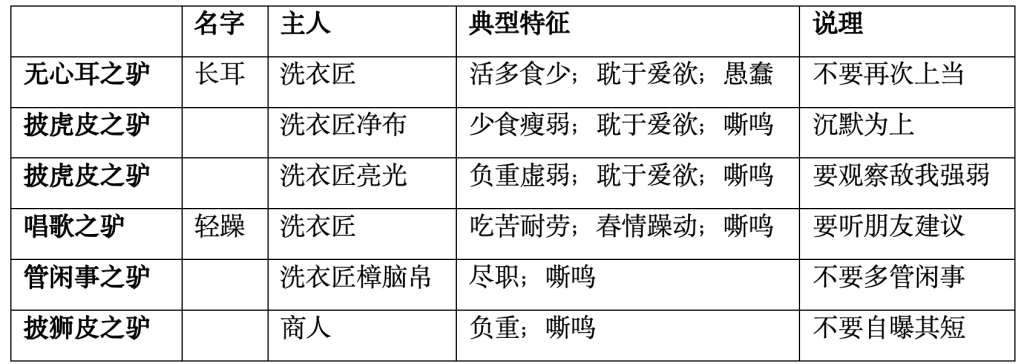 《伊索寓言》中有十幾個(gè)關(guān)于驢的故事,在內(nèi)容的豐富性上遠(yuǎn)勝印度,驢的形象也更加多元。其中,一個(gè)情節(jié)類似的故事是“驢和獅子皮”:驢披上獅皮嚇唬眾獸,狐貍因聽過其叫聲而看破其身份。其余有關(guān)驢的故事大體可分為數(shù)類: