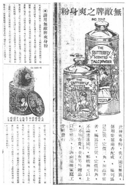 《紫羅蘭之優(yōu)待券》:瘦鵑生平,雅好紫羅蘭花,特囑天虛我生制成一種紫羅蘭之爽身粉,濃香艷美,無以復(fù)加,爰經(jīng)家庭工業(yè)社擔(dān)任發(fā)行,以公同好,裝用蓮蓬式之美術(shù)鐵瓶,上印Miss Marie Harris女史之七色照相,美麗絕倫,仍以蝴蝶為商標(biāo),定名為(無敵牌爽身粉)The “Butterfly” Scented Talc Powder。每瓶定價(jià)三角,如憑此券向購,祗收七折,實(shí)洋二角一分,大號(hào)瓶高六寸,定價(jià)四角,七折減[祗]收二角八分,郵費(fèi)另加,每單純費(fèi)二角,可寄六瓶或大號(hào)四瓶,如寄十二瓶或大號(hào)八瓶,祗需郵費(fèi)三角,惟邊遠(yuǎn)倍費(fèi)之處,照郵章加算。請與上海小西門新馬路家庭工業(yè)社或棋盤街著易堂購取可也。(1923年7月18日)