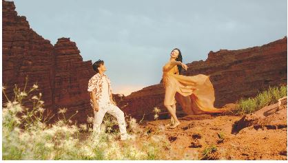 歌舞在影片中的運用對塑造人物、推動劇情發(fā)展起到了畫龍點睛的作用。市民與游客共舞的場景體現(xiàn)了民族舞蹈的開放、靈動、熱情,而萊麗在旅拍中裹著紅紗與金色披巾的旋轉鏡頭,用浪漫夸張的手法渲染了蔚藍的湖水、紅色的沙漠、潔白的雪山,主創(chuàng)借舞蹈展示山河美景,凸顯出新疆山水的人文之美。