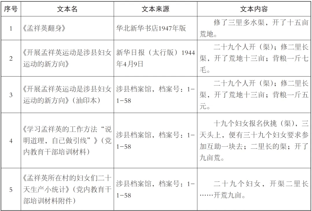 這份表格整理了涉及孟祥英與太倉(cāng)村婦救主任之間交往的各類文本,包括文學(xué)作品、公開報(bào)道與政府文書,在文本生成時(shí)間序列上由近及遠(yuǎn),相互影響,在文本等級(jí)與流通范圍上由高到低、由廣到狹,在文本細(xì)節(jié)上,也表現(xiàn)出由略到詳?shù)奶攸c(diǎn)[35]。觀察表格,我們可以意識(shí)到:從數(shù)據(jù)上看,公開報(bào)道并不比文學(xué)作品來(lái)得精確,政府文書也并不比公開報(bào)道更權(quán)威。材料3是由涉縣建設(shè)科保存的報(bào)道油印件,剛好是公開報(bào)道材料2的“底本”,對(duì)比可知,公開報(bào)道對(duì)部分?jǐn)?shù)據(jù)做了改動(dòng)。材料5與材料4來(lái)源于同一份保存在涉縣檔案館的干部培訓(xùn)材料,材料5作為材料4的附件出現(xiàn)。這意味著哪怕是兩份由相同筆跡抄寫、油印的材料,只因文件在形成時(shí)間與來(lái)源方面的差異,就提供了完全不同的數(shù)據(jù)。各類文本在數(shù)據(jù)層面的分歧清楚地向我們呈現(xiàn)出:在文本復(fù)制的過(guò)程中,數(shù)據(jù)往往并不穩(wěn)定,反倒是以婦救主任的轉(zhuǎn)變論證孟祥英工作方法之正確性的敘事模式得以毫無(wú)損耗地流傳下來(lái)。也就是說(shuō),與生產(chǎn)經(jīng)驗(yàn)相比,敘事模式反而是更值得繼承的面向。