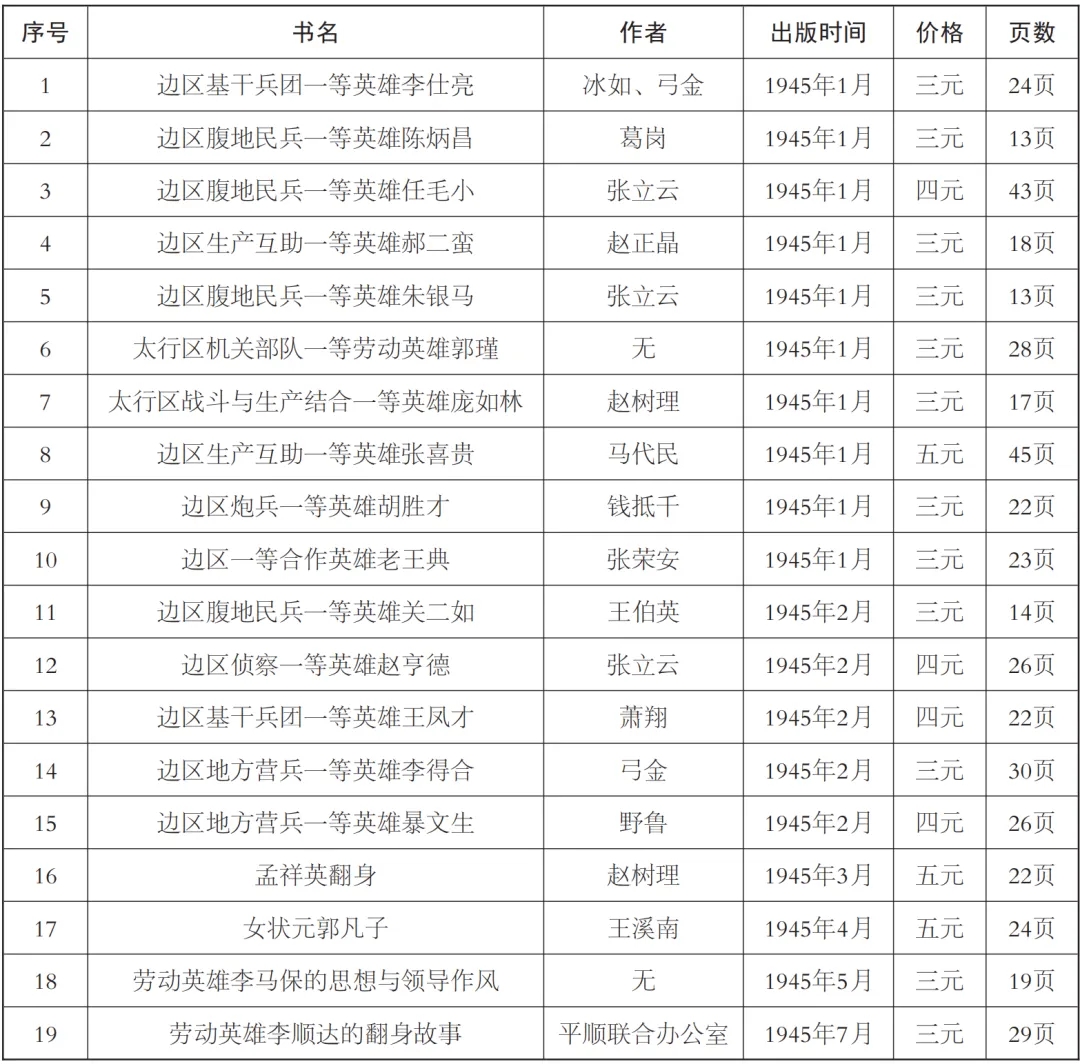 [12] 據(jù)筆者目前對(duì)相關(guān)書籍的搜集與統(tǒng)計(jì),這套叢書至少包含19冊(cè),分成三批出版:1945年1月出版10種,2月出版5種,包含趙樹理《孟祥英翻身》在內(nèi)的4冊(cè)書在3至7月陸續(xù)推出。實(shí)物見(jiàn)于中國(guó)國(guó)家圖書館、北京大學(xué)圖書館與中國(guó)人民大學(xué)圖書館。特此感謝中國(guó)國(guó)家圖書館善本古籍閱覽室工作人員、北京大學(xué)圖書館李大釗閱覽室孫雅馨老師與中國(guó)人民大學(xué)圖書館善本特藏部朱小梅老師提供實(shí)物并各類信息。