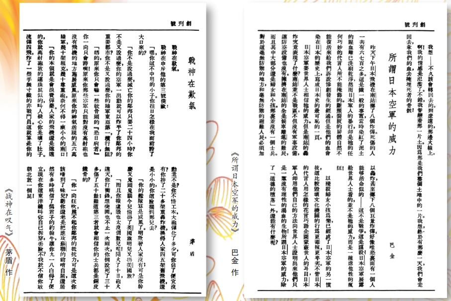 同樣不可忽視的是巴金在《烽火》出版過程中的關(guān)鍵作用。作為《吶喊》和《烽火》的聯(lián)合創(chuàng)刊人之一,巴金不僅全程參與了從《吶喊》到《烽火》的編輯出版工作,更是從《烽火》第六期開始接任了茅盾的主編任務(wù)。在戰(zhàn)火紛飛、出版條件極其困難的情況下,巴金始終堅持組稿和撰寫文章,甚至為了確保了刊物的持續(xù)出版,他隨身攜帶未刊稿件,輾轉(zhuǎn)于中國南方地區(qū)躲避戰(zhàn)爭并隨時尋找機會進行刊印。巴金的文學(xué)創(chuàng)作一直以直面現(xiàn)實、情感熾烈和附有批判性而著稱,在為刊物供稿的過程中,他將個人情感與民族命運緊密結(jié)合,用文字向社會傳達了人民的處境和心聲。1937年8月28日,日軍轟炸上海南站,造成大量平民傷亡,巴金憤慨萬分,提筆撰寫了《所謂日本空軍的威力》一文發(fā)表在《烽火》上,嚴(yán)詞譴責(zé)日軍:“這不是戰(zhàn)爭,這是謀殺!日本空軍展露給世界人士看的,并不是它的威力,而是一種虐他性的瘋狂!”他將日軍稱為“一群沒有理性的渴血生物”,以此來表達他作為中國人的憤怒和作為一名作家的良知。據(jù)重慶師范大學(xué)統(tǒng)計,巴金先后在《吶喊》與《烽火》上發(fā)表各類作品30余篇,體裁涵蓋雜文、小說、詩歌與譯作,是《吶喊》和《烽火》供稿最多、影響最大的核心作者之一。