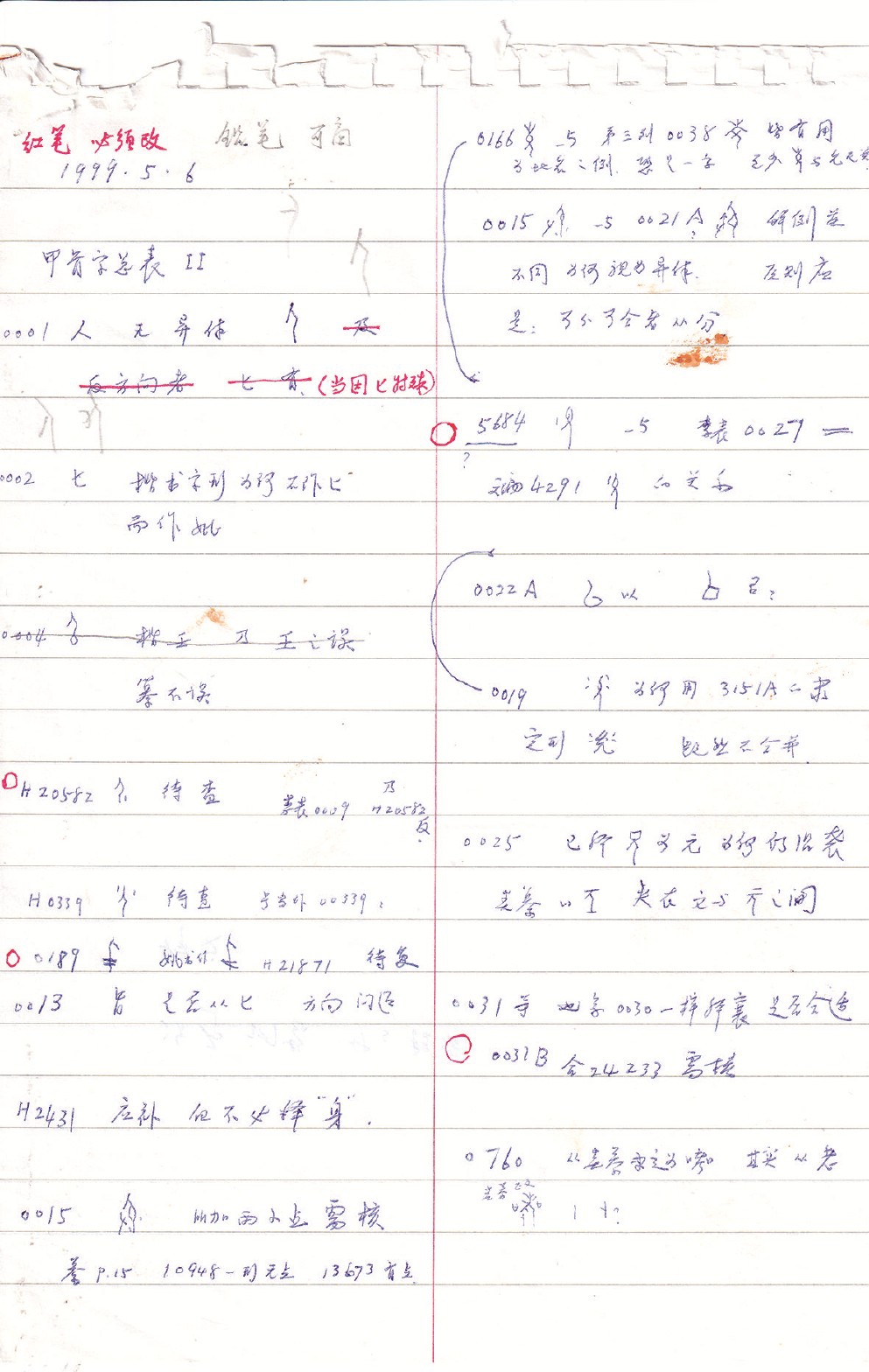 裘先生離別中大前幾天,陳方正所長(zhǎng)交給我這份沉甸甸的24頁(yè)審閱報(bào)告復(fù)印手稿。裘先生清秀工整的字體令我驚訝,更多的是感動(dòng)與愧疚,我慶幸有此機(jī)緣得到裘先生親炙教言,平凡的我居然消耗了他那么多精力和心血。字形表152個(gè)部首下,從第1字到最后第4071字,每一個(gè)臨摹的字,哪怕細(xì)微一點(diǎn)的筆畫(huà)都沒(méi)有逃過(guò)裘先生的眼睛,可以說(shuō)裘先生把全部甲骨文字形表逐一與拓片核對(duì)了一遍,包括最容易忽視的干支表,都沒(méi)有放過(guò)。