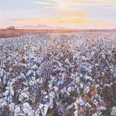 如果說(shuō)改革開(kāi)放初期的新疆油畫(huà),多聚焦于草原牧歌、巴扎風(fēng)情等靜態(tài)抒寫(xiě),那么當(dāng)下創(chuàng)作則將視角轉(zhuǎn)向動(dòng)態(tài)發(fā)展,讓活力新疆日日新的蓬勃?dú)庀筌S然于畫(huà)布之上。付劍鋒深耕工業(yè)題材四十載,在其《逆光——國(guó)之重器系列組畫(huà)之六十六》等作品中,獨(dú)山子的石油管道在光影交織中化作鋼鐵脊梁,石油工人的身影與機(jī)械齒輪構(gòu)成“人與時(shí)代共生”的視覺(jué)史詩(shī)。馬勇《新疆棉——沃野》(見(jiàn)圖)更是以淋漓盡致的筆觸,讓機(jī)械化采棉的金色軌跡與天山雪峰形成冷暖對(duì)話,棉田如云海般翻滾,既是對(duì)“白色黃金”產(chǎn)業(yè)的禮贊,也是對(duì)科技賦能新疆農(nóng)業(yè)的生動(dòng)詮釋。這些作品不再是對(duì)現(xiàn)實(shí)場(chǎng)景的簡(jiǎn)單復(fù)刻,而是將經(jīng)濟(jì)社會(huì)發(fā)展成就轉(zhuǎn)化為可觸摸的美學(xué)符號(hào),讓觀眾在形色的視覺(jué)沖擊中感知新疆大地的歷史變遷。