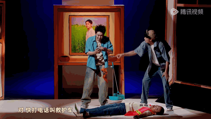 其次,或許有讀者質(zhì)疑,我在是否有意制造了兩種笑點的對立——它們并非兩種截然不同的發(fā)笑方式,而是作為一個有機(jī)整體服務(wù)于內(nèi)容。在此,我想重復(fù)前面的內(nèi)容,即沖突式笑點構(gòu)造了營造笑料的方式,而這是拼接式笑點得以自然出現(xiàn)的基礎(chǔ)。如果沒有漫才式的“怪異”與“正常”的沖突,這種毫無邏輯的拼貼是無法令人發(fā)笑的。但是,拼接式笑點在相當(dāng)程度上超越了沖突式笑點,成為一種更為特殊的發(fā)笑方式,以至于可以被單獨提煉出來。如果我們將兩種笑點共置一處,便可以看到其中的差異。以《一年一度喜劇大賽》另一個類似小品《父親的葬禮》作對比,這一漫才小品典型體現(xiàn)了沖突式笑點的應(yīng)用。全劇自然也讓人摸不著頭腦,不過,它是以中二世界與正常世界的全然對立為基礎(chǔ)的。也即是說,中二世界存在某種內(nèi)在的、自足的邏輯,支撐起父親葬禮的整體環(huán)節(jié),甚至構(gòu)造出一個整體的意義。但是,《技能五子棋》這種使用現(xiàn)實碎片的造笑方式,則是壓制任何層面上的意義生成,僅僅是以并置的方式將碎片呈現(xiàn)出來、拼接在一起。而當(dāng)我們將《技能五子棋》內(nèi)部的笑點并置,我們會發(fā)現(xiàn)也正是拼接而非沖突引發(fā)了真正的“笑”。一個細(xì)節(jié)是李嘉誠大呼一聲“這才是真正的飛沙走石”,隨后將五子棋拋向場邊,張興朝拿著球棒揮舞,手動加了一句音效“?!?。此時張呈過來吐槽:“這是棒球!”可以看到,此時沖突式笑點已經(jīng)形成,也確實引人發(fā)笑。但笑聲更大之處則在后面,恰恰是張興朝拿著球棒說了一聲“呀嘞呀嘞”后迅速消失時,哄堂大笑才爆發(fā)了。