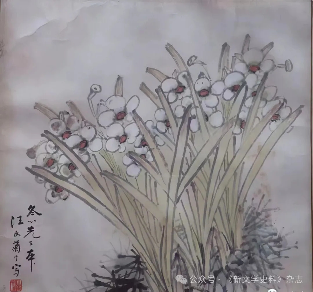 汪曾祺父親汪菊生是位眼科醫(yī)生,家鄉(xiāng)流傳著他許多醫(yī)者仁心的故事,且多才多藝,亦是一位畫家,我于偶然中得到一幅他畫的“水仙圖”。