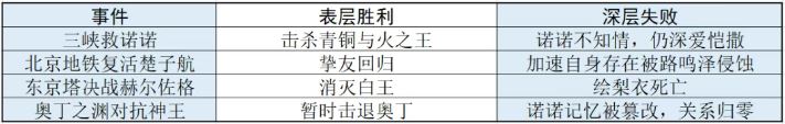 “(心有欠缺)→產生欲望→鍛煉能力→實現(xiàn)目標(失?。玫姜勝p(受到原諒)”這一行動模態(tài),可追溯至格雷馬斯的行動模型與托多羅夫用句法方式研究敘事語法的融合變體,其本質是創(chuàng)傷驅動型英雄的成長范式⑥。路明非顛覆類型小說常規(guī)的成長邏輯,他的每一次“成功”都伴隨更深刻的失敗,形成解構英雄敘事的反諷結構。如下表所示: