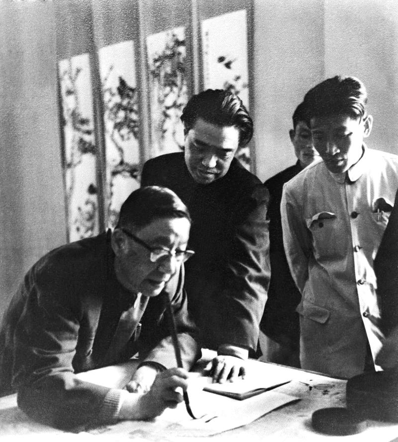 1962年4月,老舍在廣東參加潮劇座談會(huì)后為潮劇題詞。左二為陽翰笙、右一為潮劇作曲家馬飛。