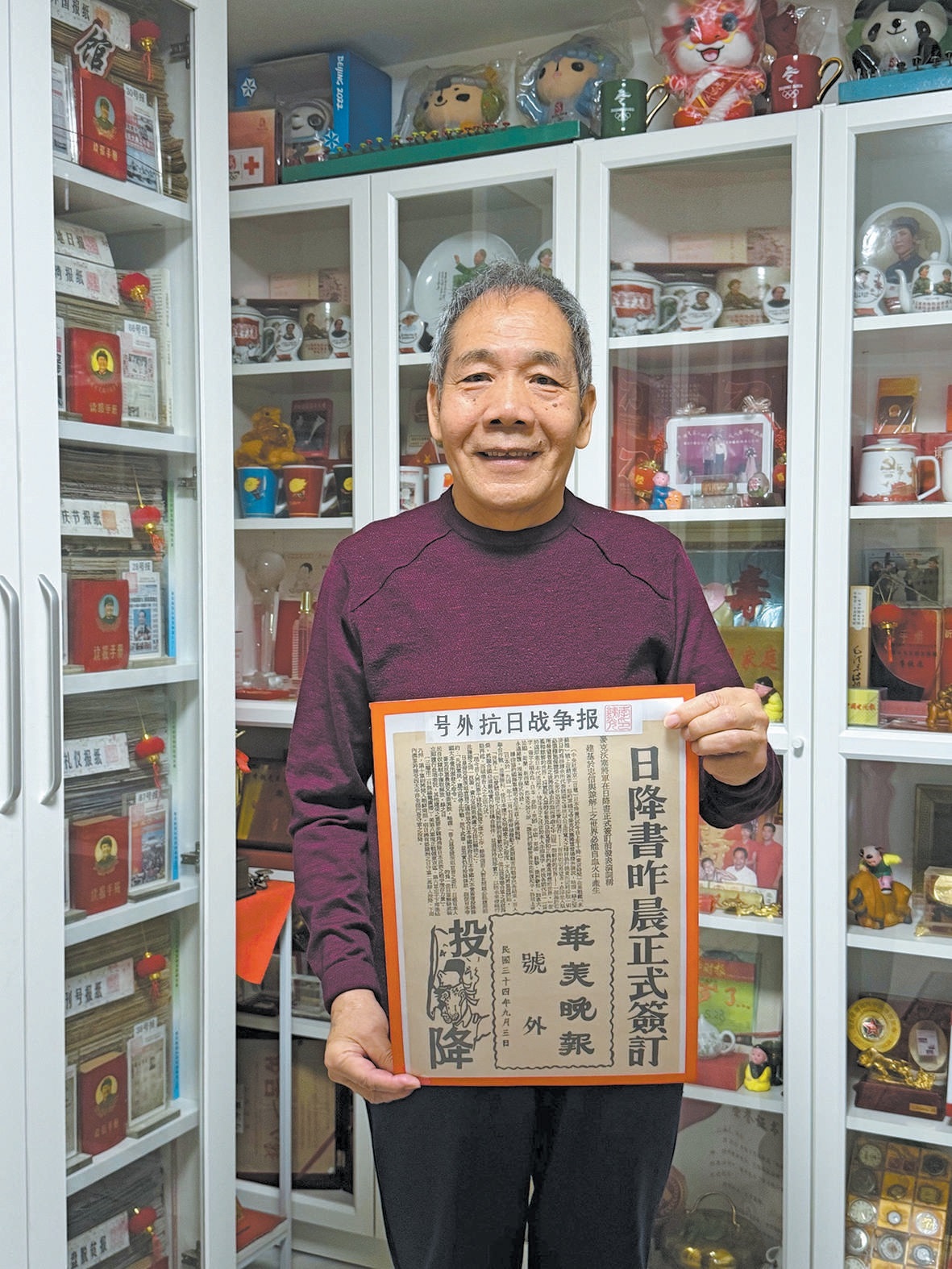 今年夏天,李鐵光又忙著辦起了“紀(jì)念中國人民抗日戰(zhàn)爭暨世界反法西斯戰(zhàn)爭勝利80周年”報展。他從400多份抗戰(zhàn)相關(guān)報紙中精選出280份,其中1945年9月3日的《華美晚報》號外格外引人注目,紙頁上“日降書昨晨正式簽訂”的標(biāo)題,成了最有力的歷史見證。開展當(dāng)天,不少家長帶著孩子來參觀,李鐵光站在報紙前,給孩子們一一講述。“我們要記住過去,才能珍惜現(xiàn)在的好日子。”李鐵光說。