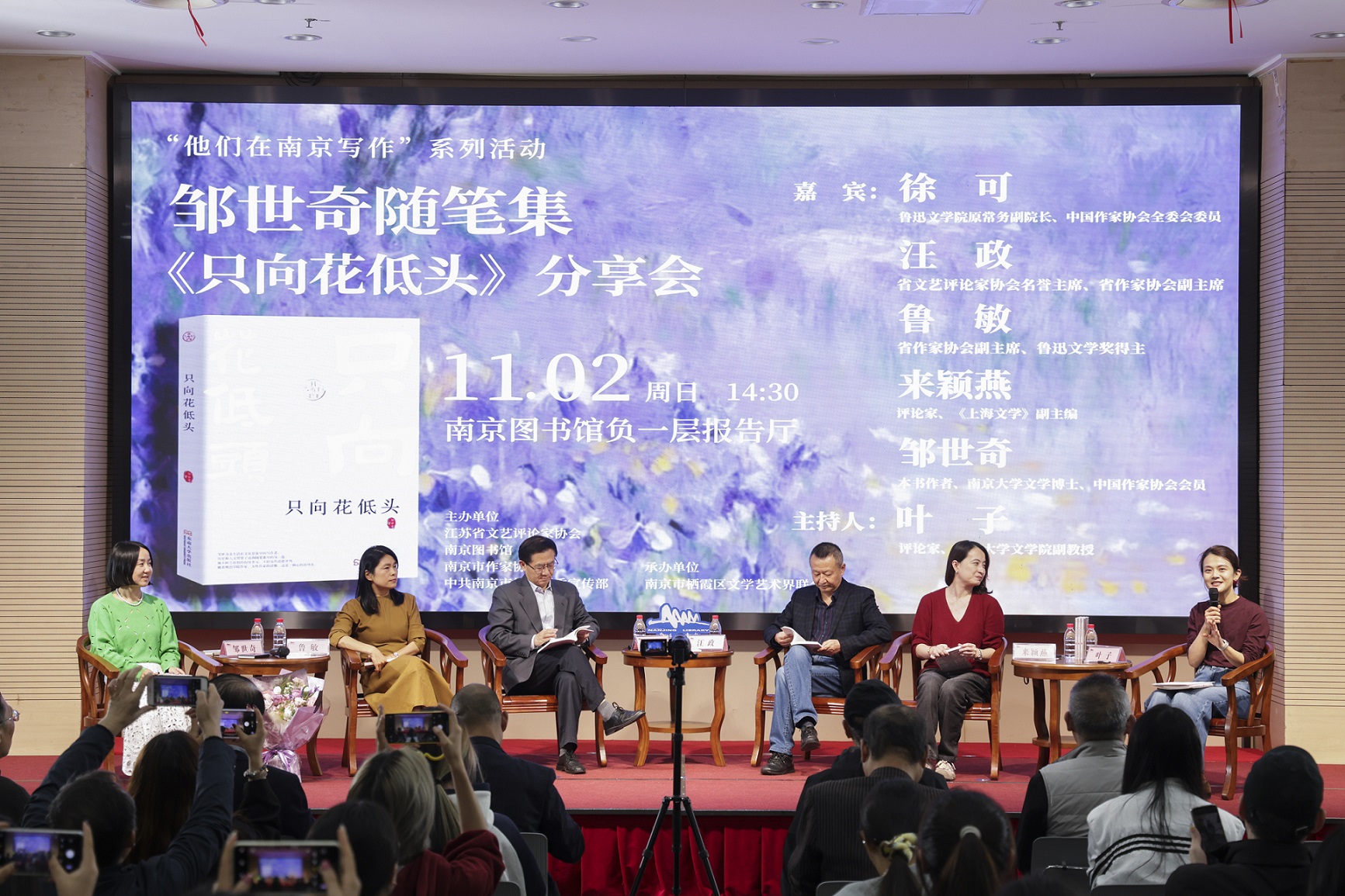 11月2日,江蘇省文藝評(píng)論家協(xié)會(huì)、南京市作家協(xié)會(huì)、中共南京市棲霞區(qū)委宣傳部主辦的青年作家鄒世奇隨筆集《只向花低頭》分享會(huì)在南京圖書館舉行。魯迅文學(xué)院原常務(wù)副院長(zhǎng)、中國(guó)作家協(xié)會(huì)全委會(huì)委員徐可,江蘇省文藝評(píng)論家協(xié)會(huì)名譽(yù)主席、省作家協(xié)會(huì)副主席汪政,江蘇省作家協(xié)會(huì)副主席、作家魯敏,評(píng)論家、《上海文學(xué)》副主編來穎燕,本書作者、南京大學(xué)文學(xué)博士、中國(guó)作家協(xié)會(huì)會(huì)員鄒世奇參與分享,分享會(huì)由評(píng)論家、南京大學(xué)文學(xué)院副教授葉子主持。
