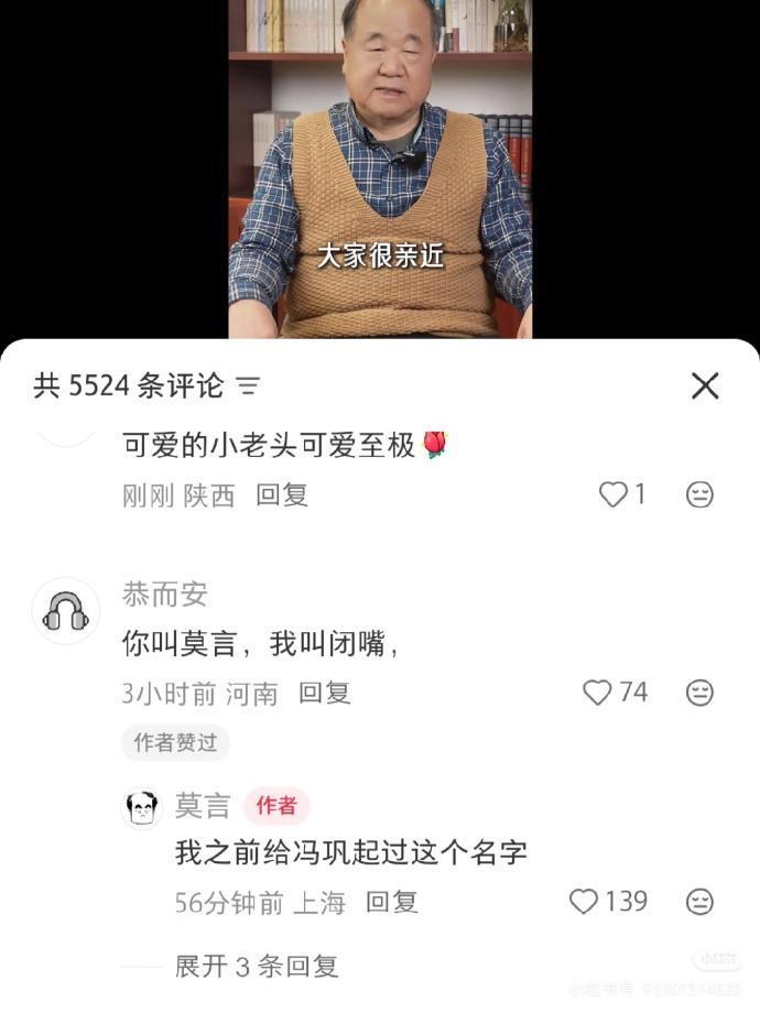 在評論區(qū),網(wǎng)友和莫言各種玩梗,莫言以輕松幽默的話語回復(fù),歡樂不斷。