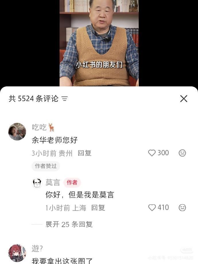 有網(wǎng)友打招呼:余華老師您好!莫言回復(fù):你們,但是我是莫言。
