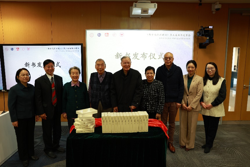 開幕式致辭結束后,張中載、劉意青、王逢振、殷企平、金莉、李鐵、 陳方、邢印姝共同為新書揭幕,并合影留念。
