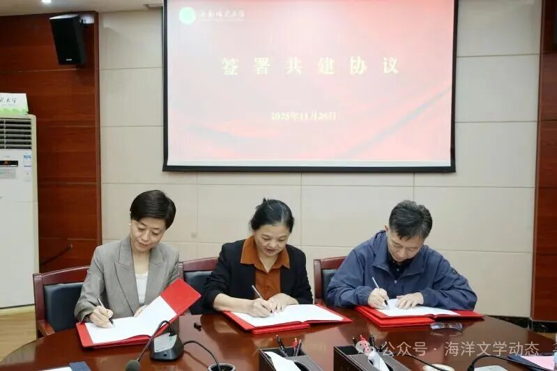 海南師范大學(xué)文學(xué)院院長王學(xué)振教授、海南省作家協(xié)會專職副主席王姹、海南省出版發(fā)行集團(tuán)副總經(jīng)理兼南方出版社總編輯古莉分別代表海南師范大學(xué)、海南省作家協(xié)會、南方出版社,簽署了三方共建協(xié)議。
