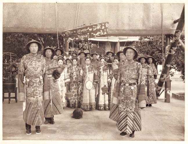 慈禧左右兩側(cè)分別站立四格格、隆裕等女性陪同人員,前后兩側(cè)則為太監(jiān)。其中,左側(cè)最前方為宮廷總管太監(jiān)李蓮英;右側(cè)最前方為內(nèi)廷回事太監(jiān)崔玉貴。